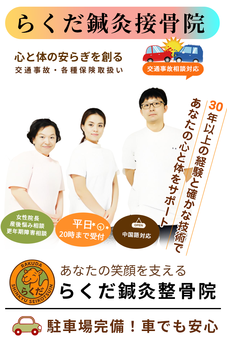 交通事故後の後遺症・むち打ちなどでお困りの方は、らくだ鍼灸整骨院